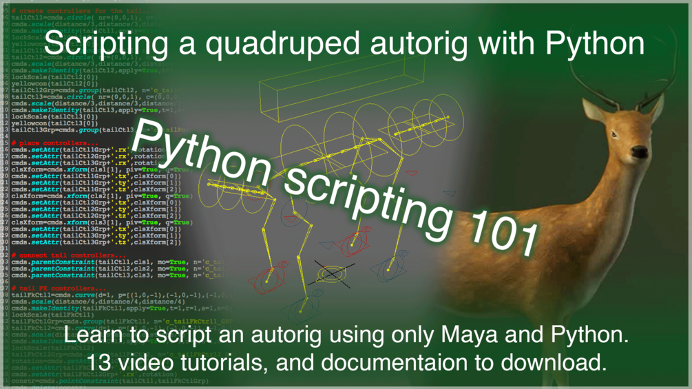 This video series is for anyone interested in scripting, but will also teach you how to rig a four legged creature, and at the same time create a script that you can use again and again to build rigs for your projects.